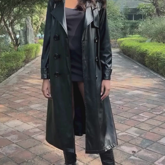 The Vanta Luxe Trench is a black, faux leather coat featuring a coat collar, full sleeves, and a comfortable fit. Priced at ₹4,599, it offers free shipping, 7-day delivery, and options for return or exchange with COD. Quality and customer satisfaction are guaranteed.