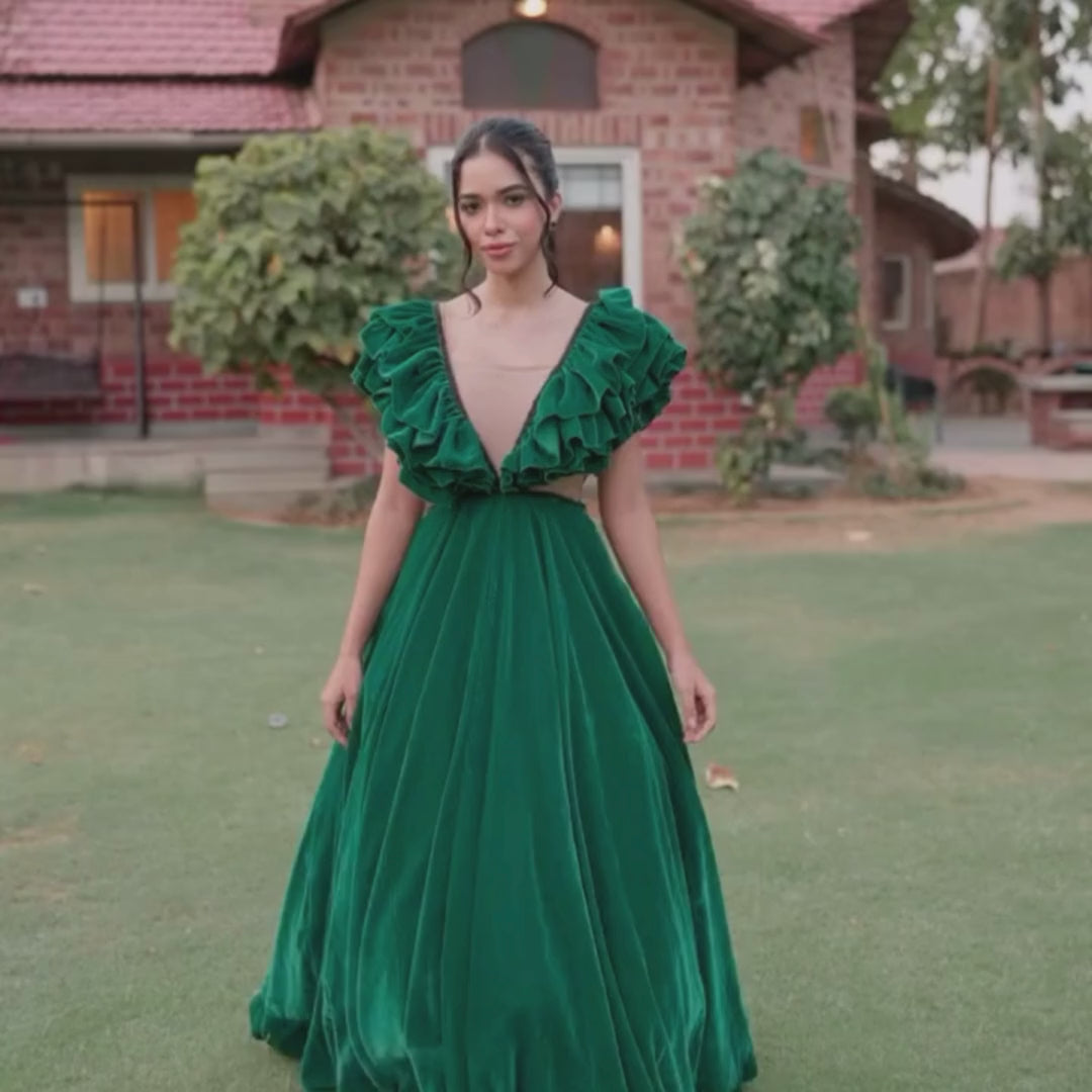 Immerse in elegance with the Emerald Velvet Enchantment Gown. Be the center of attraction adorned in luxury imported velvet with a Multi-Layer Frill Bodice & deep v-neck. This dress exhibit’s a sleeve-less design and an elegant princess silhoutte that is ideal for formal occassions. For added comfort, the dress is flairy from the waist. Multi size options are available, however dry clean only to preserve its charm.
